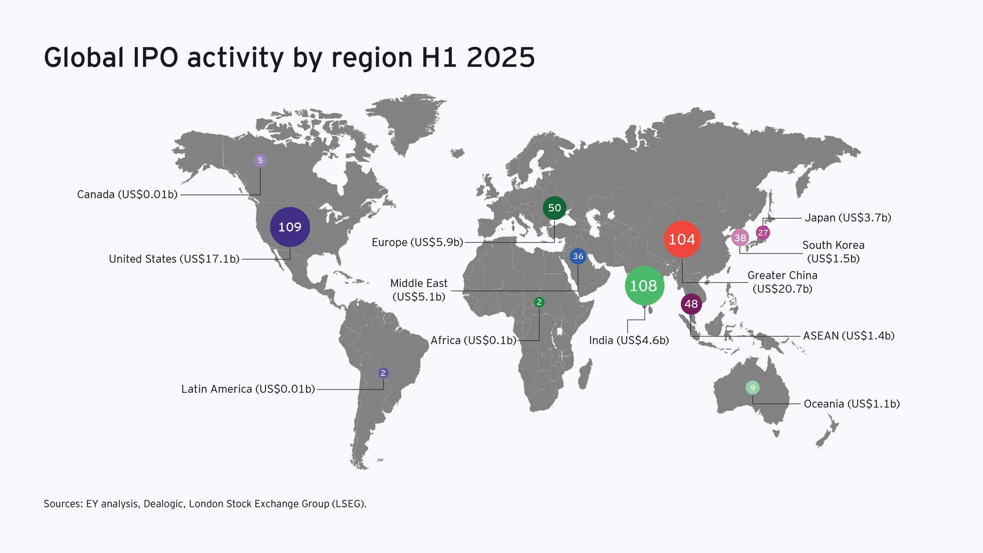 Actividad global de OPI por región, primer semestre de 2025. Fuente: EY.