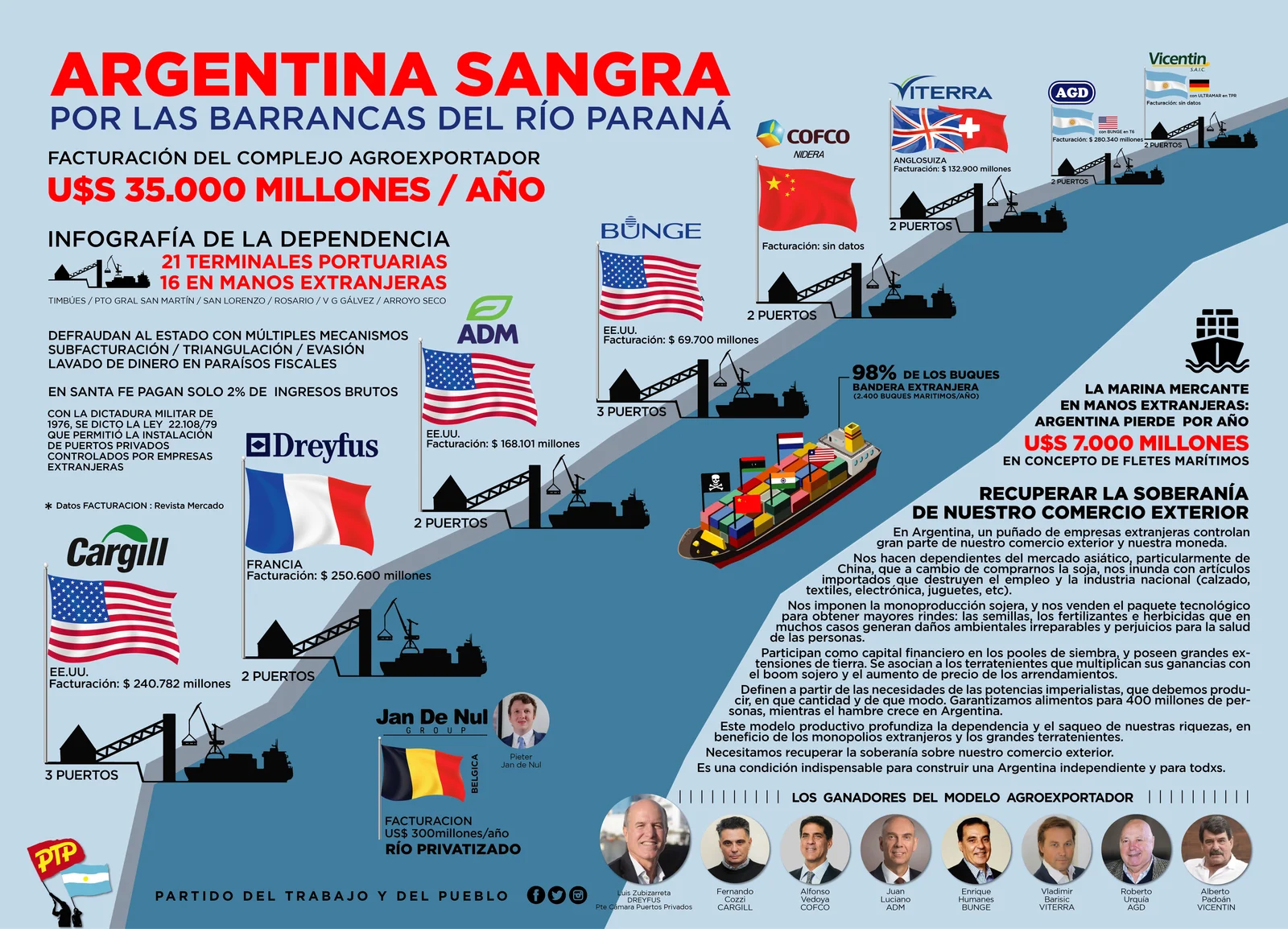 Estas empresas controlan el complejo agroexportador. Como se puede ver en el gráfico ‘Infografía de la Dependencia’ realizado por Luciano Orellano, de las 21 terminales portuarias 16 están en manos extranjeras. Esos puertos privados se habilitaron durante la última dictadura militar, con la Ley N° 22.108.
