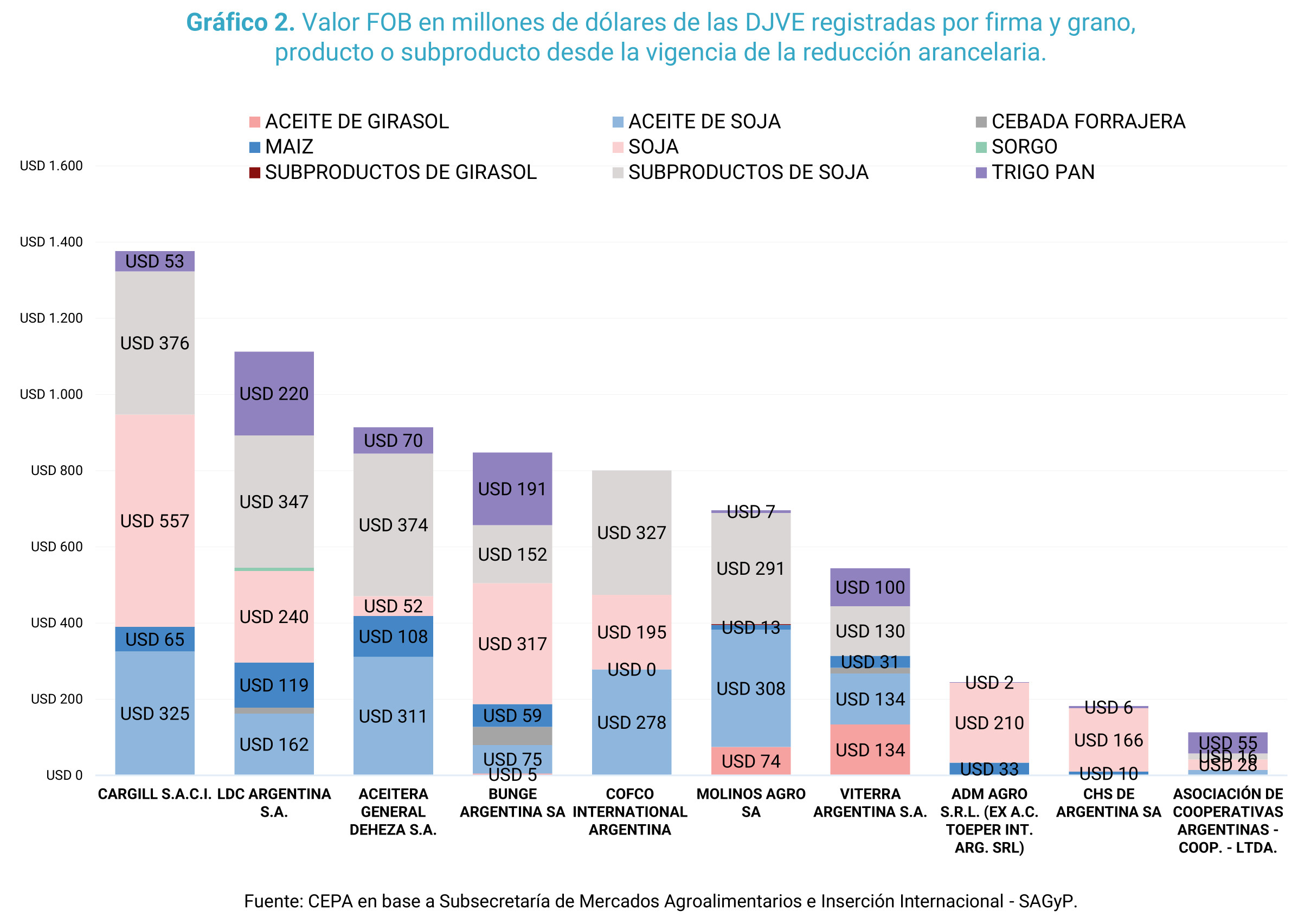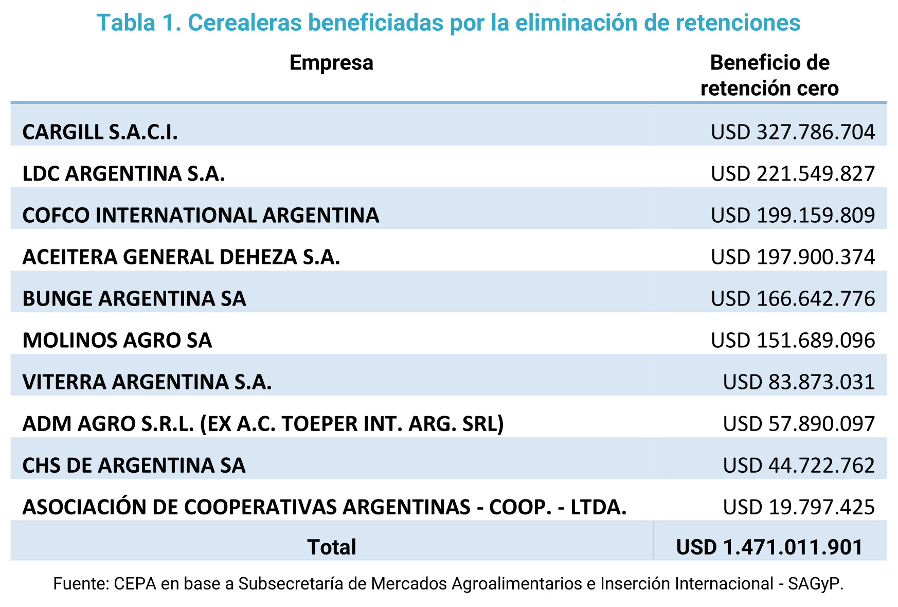Cargill, LDC (Dreyfus), Cofco, Aceitera General Deheza, Bunge, Molinos, Viterra, ADM, CHS y Asociación de Cooperativas Argentinas obtuvieron el beneficio de 1.471 millones de dólares por la exención de retenciones, calculó CEPA en base a la Subsecretaría de Mercados Agroalimentarios.