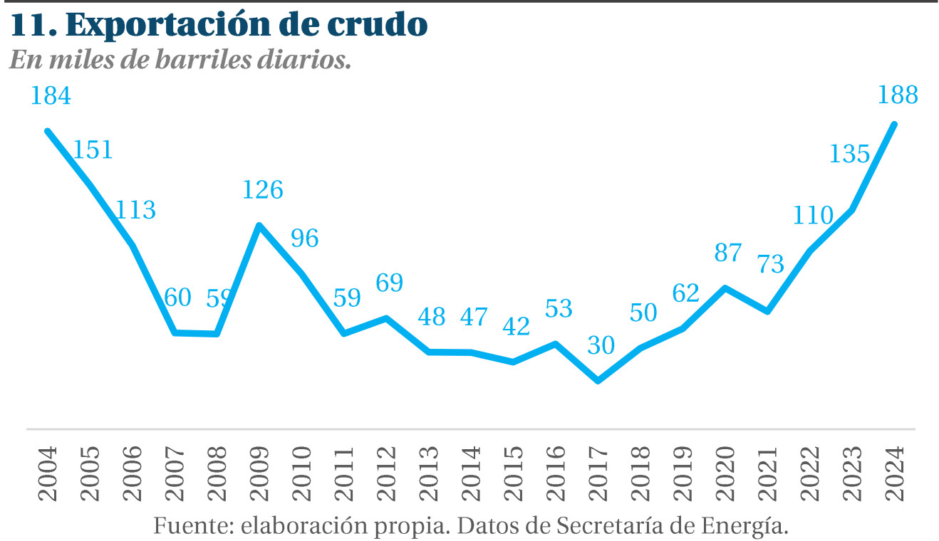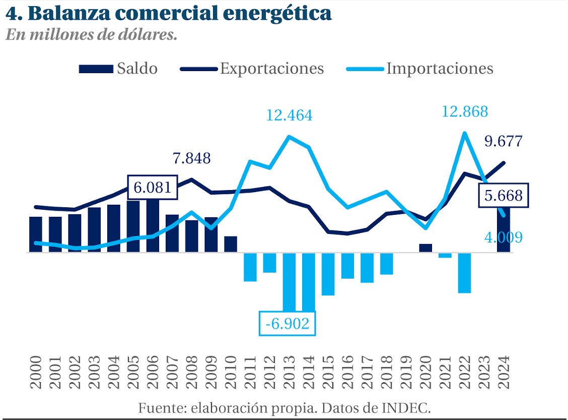 on la explotación de los recursos en la formación de Vaca Muerta, el 2024 fue un año récord para los hidrocarburos. Las exportaciones de crudo promediaron 188.000 barriles diarios: 300% respecto a 2010, casi el doble que hace dos años y la balanza comercial volvió a ser positiva como en la primera década del siglo.