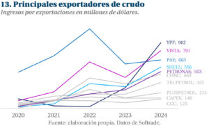 YPF (51% de las acciones son del Estado Nacional) está a la cabeza de las exportadoras de crudo, con un total de 902 millones de dólares facturados en 2024 y es la única con casa matriz en Argentina. El 95% de lo que exporta sale por Chile, utilizando el Oleoducto Trasandino.