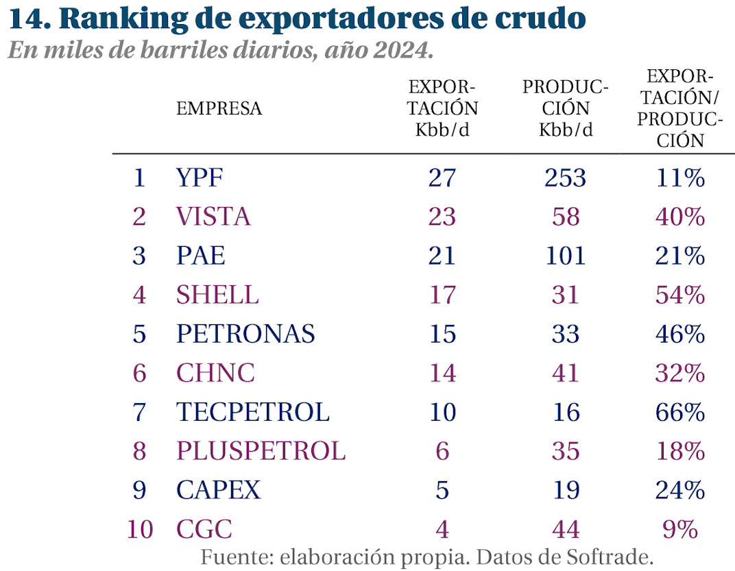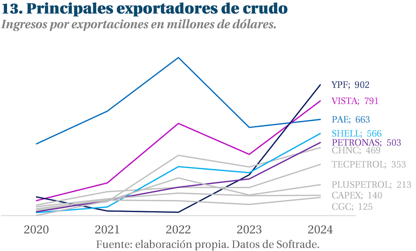 YPF (51% de las acciones son del Estado Nacional) está a la cabeza de las exportadoras de crudo, con un total de 902 millones de dólares facturados en 2024 y es la única con casa matriz en Argentina. El 95% de lo que exporta sale por Chile, utilizando el Oleoducto Trasandino.