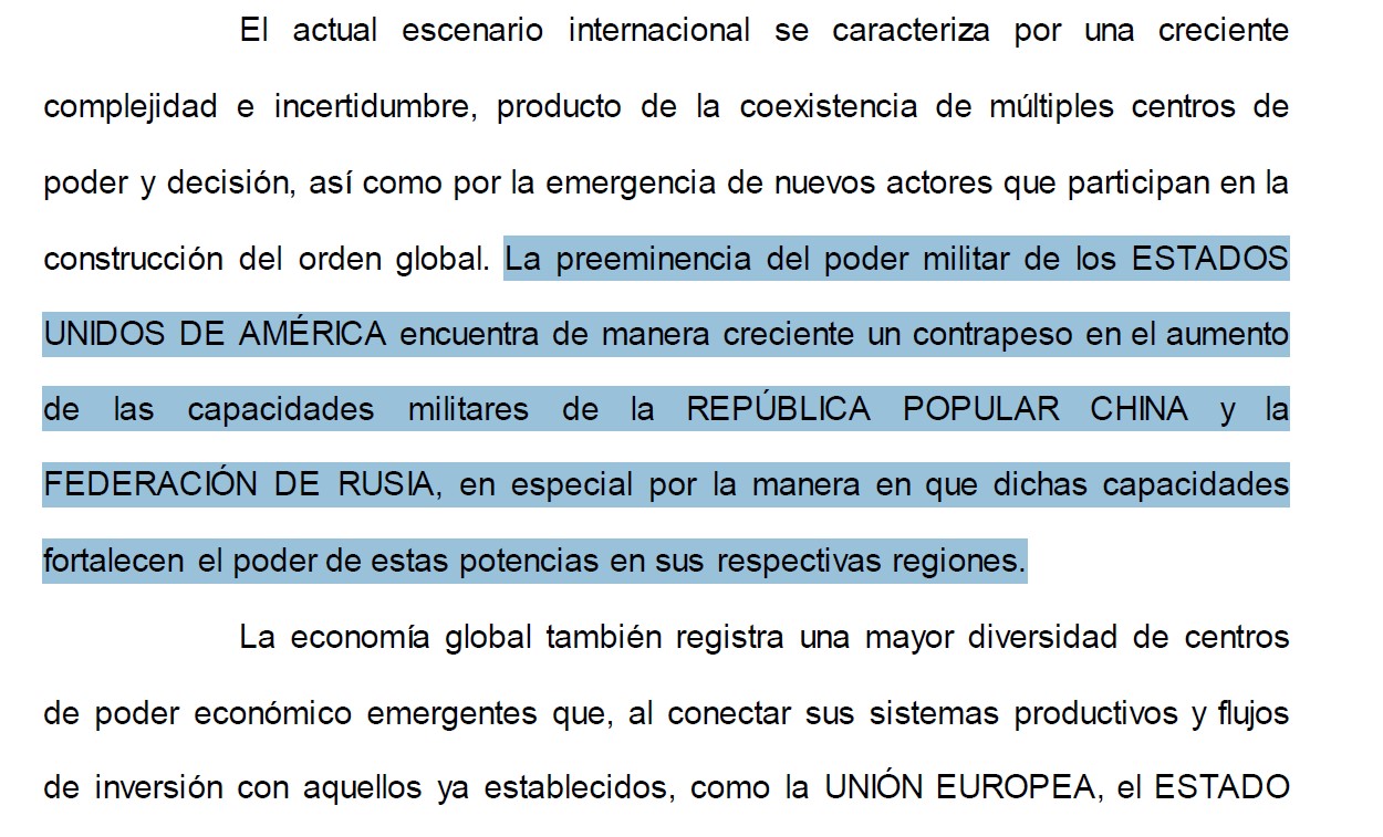 “La preeminencia del poder militar de los ESTADOS UNIDOS DE AMÉRICA encuentra de manera creciente un contrapeso en el aumento de las capacidades militares de la REPÚBLICA POPULAR CHINA y la FEDERACIÓN DE RUSIA”, dice textual el Anexo I de las DPDN impulsada por el ex presidente Macri.