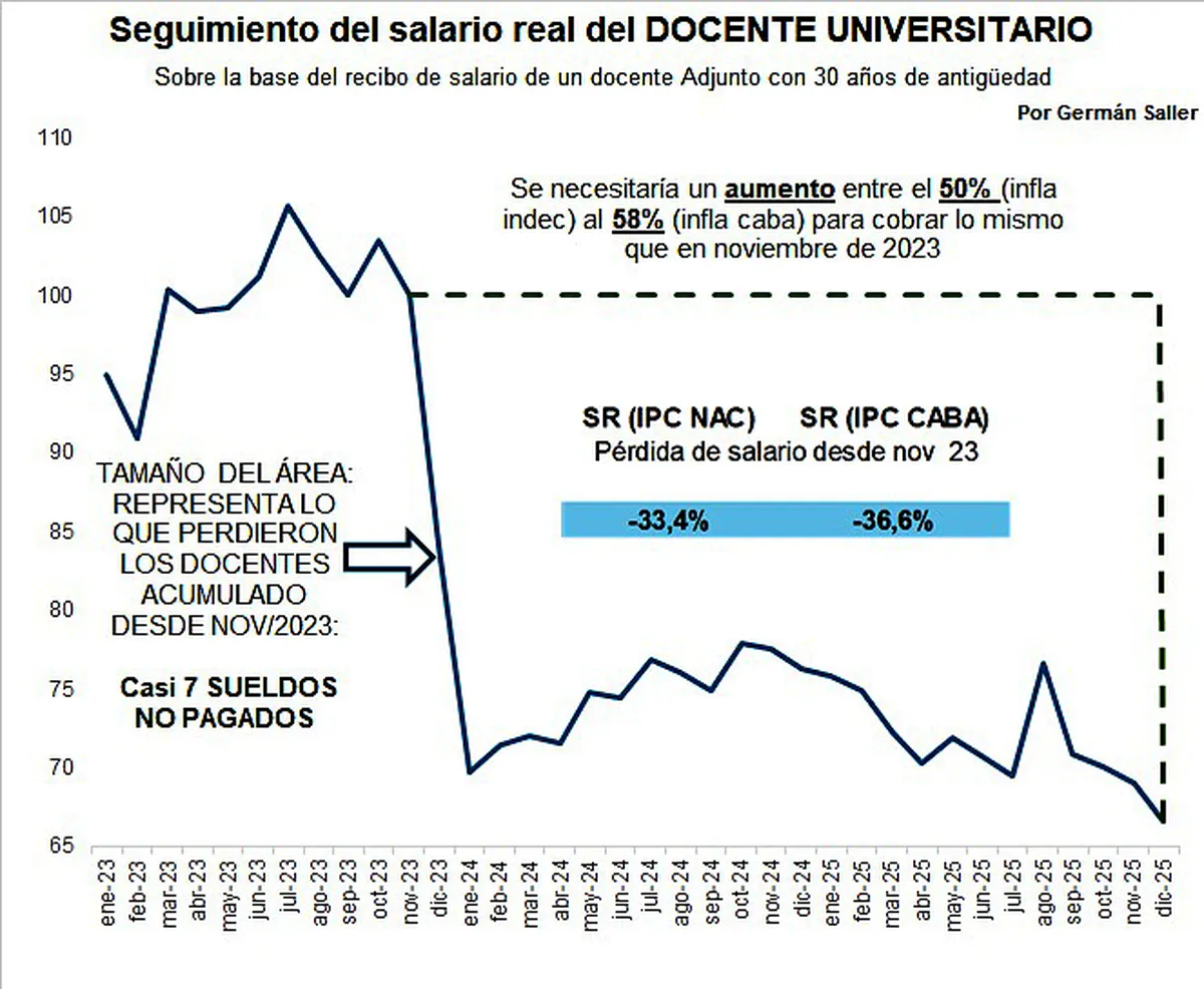 Y es que, según un informe del economista de la UNLP, Germán Saller, el deterioro del salario del docente universitario fue del 33,4%, durante la gestión presidencial de Javier Milei. “En los 25 meses transcurridos, los universitarios perdieron 7 sueldos de los de noviembre de 2023”, dijo a Puntal. “Yo creo que si hago una serie de largo plazo es probable que hoy estén en el 50% de lo que se cobraba en el pico que tuvimos en 2015 y 2016”, agregó.