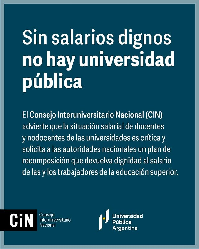 El Consejo Interuniversitario Nacional (CIN), compuesto por los rectores de las universidades del país, también se expresó en un comunicado, exigiendo «una vez más, el inmediato cumplimiento de la actual ley de financiamiento universitario”, aprobada el año pasado por el Congreso, “para recuperar el salario perdido en 2024 y 2025”. Y destacó la exigencia de una “urgente convocatoria a paritaria docente y nodocente para recomponer la pérdida salarial que se está sufriendo en 2026”, postura que fue acompañada por la Asociación de Ex Rectoras y Rectores de las Universidades Públicas (AERUP).