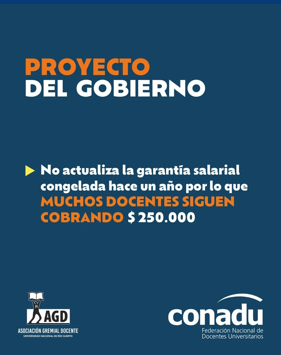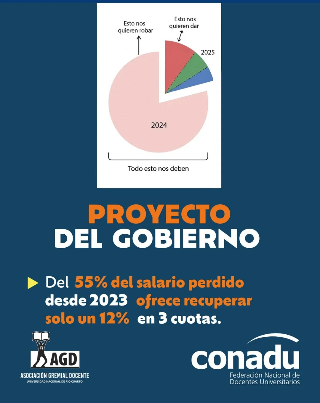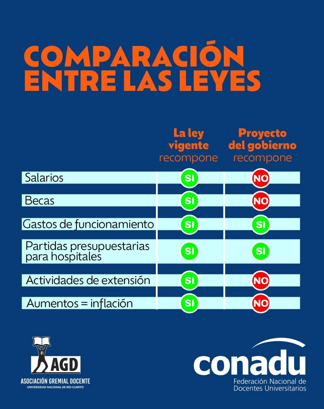 Y es que el Gobierno nacional presentó un proyecto de ley para reformar la LFU: “una ley vigente que se niega a cumplir hace cuatro meses, a pesar de que fue votada seis veces por el Congreso y cuenta con una medida cautelar favorable al sistema universitario y a sus trabajadores/as”, según explicó la Conadu y que describe: “no sólo se niega a cumplir los aumentos salariales, en becas y en gastos de funcionamiento previstos, sino también una parte de la ley que el decreto que la promulga jamás suspendió: la convocatoria a paritarias”.