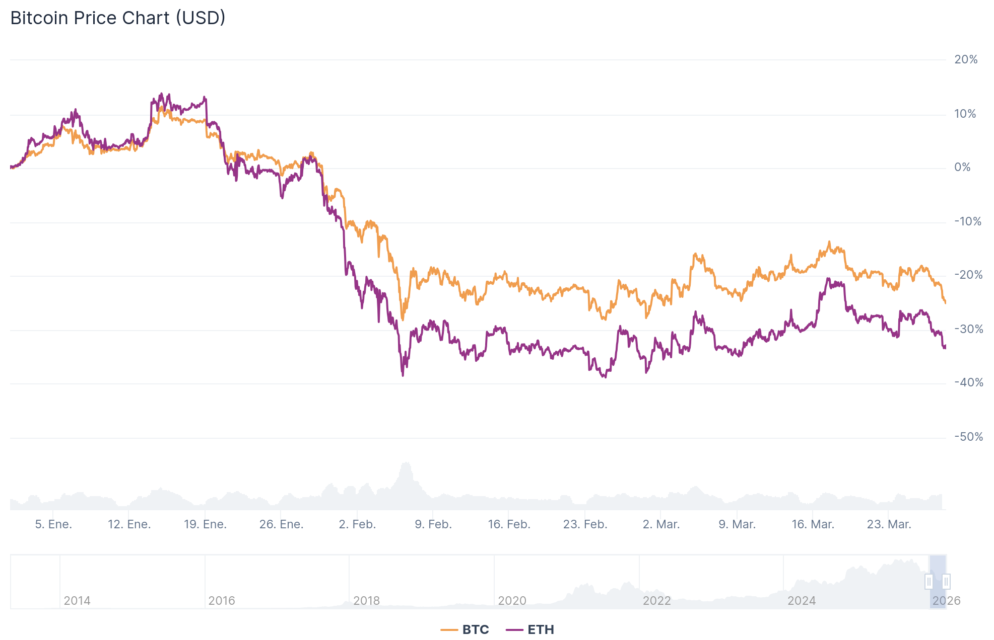 Sólo en 2026, Bitcoin (BTC) perdió un 24,5% de su valor y Ethereum (ETH) un 33,2%, por citar a las dos criptos principales que representan cerca el 75% del mercado global. En las últimas semanas hubo un repunte, pero habían descendido un 30% y 40%, respectivamente.